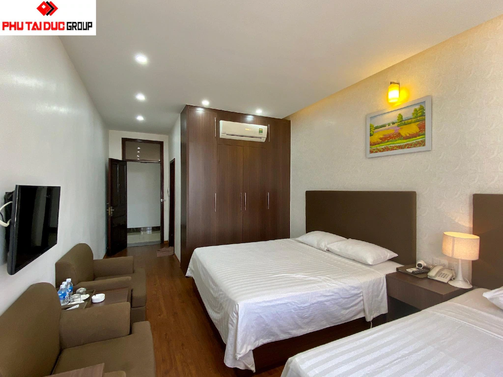 📶 Tiện ích công nghệ & Giải trí đồng bộ: Mỗi phòng đều được trang bị đầy đủ các trang thiết bị hiện đại theo tiêu chuẩn 3 sao quốc tế: Smart TV truyền hình cáp đa kênh, điều hòa nhiệt độ hai chiều, minibar, ấm siêu tốc và máy sấy tóc. Hệ thống Wifi tốc độ cao riêng biệt cho từng tầng đảm bảo kết nối thông suốt, đáp ứng hoàn hảo nhu cầu giải trí hay xử lý công việc trực tuyến của khách công tác.